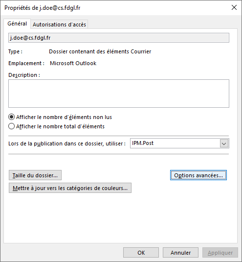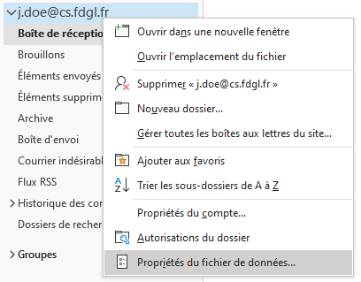 - Clic droit sur votre adresse mail, puis "Propriétés du fichier de données …" :